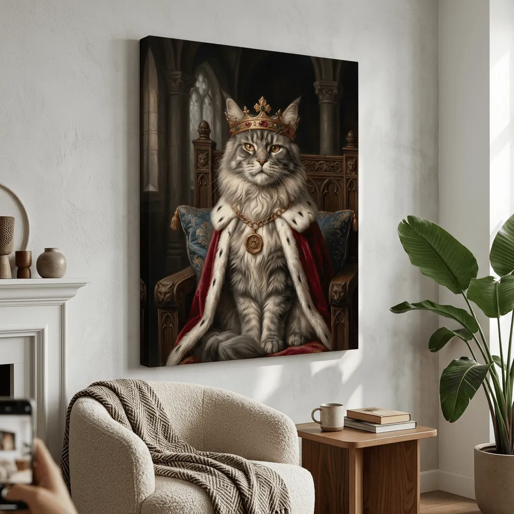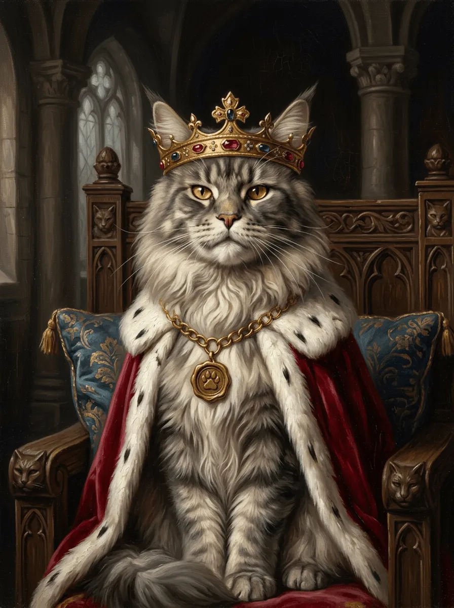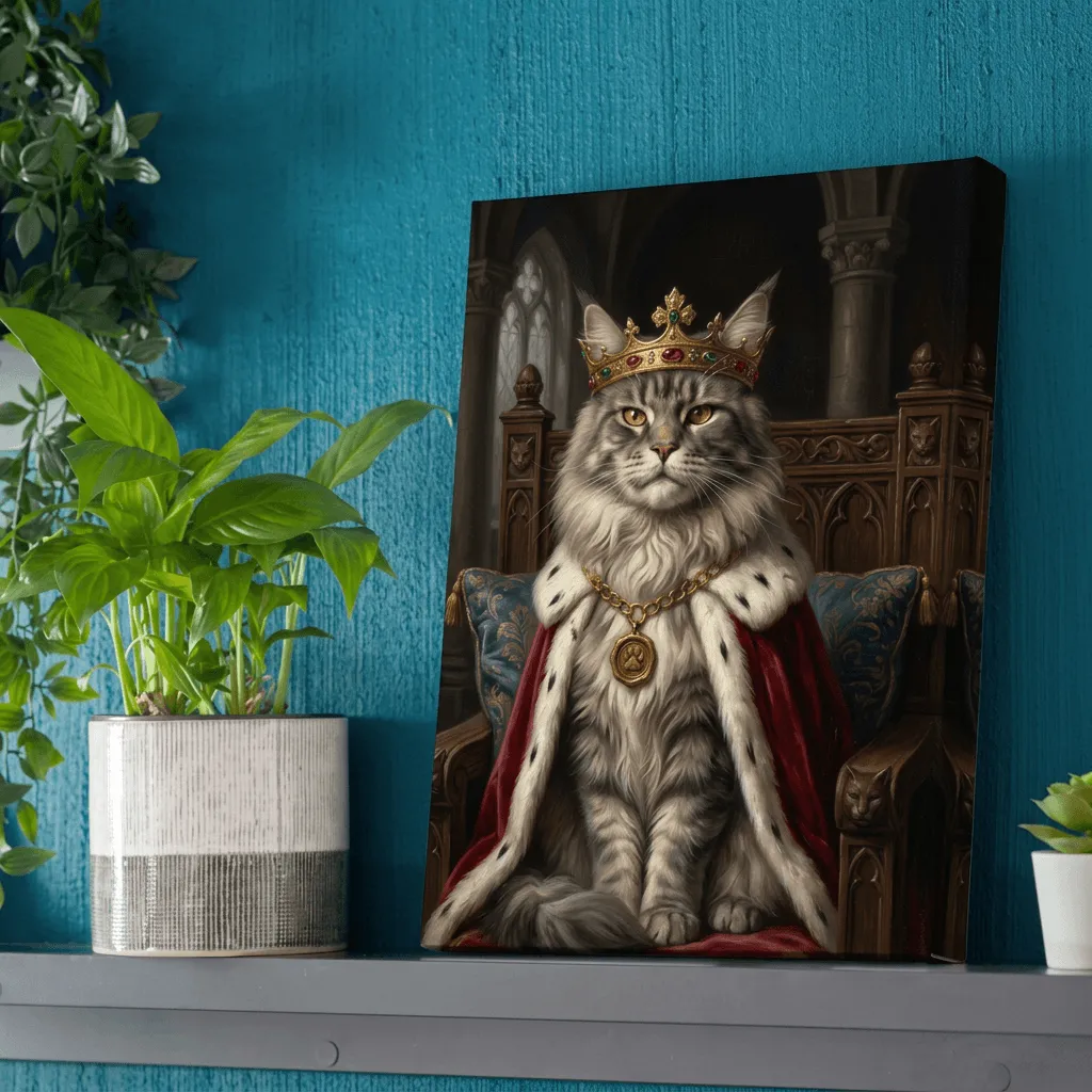 This striking realistic oil painting captures a majestic cat adorned with an ornate golden crown and jeweled chain, seated regally on an ornamental throne. Rich textures and warm amber lighting bring royal grandeur to this whimsical canvas print, perfect for adding personality and charm to any room.