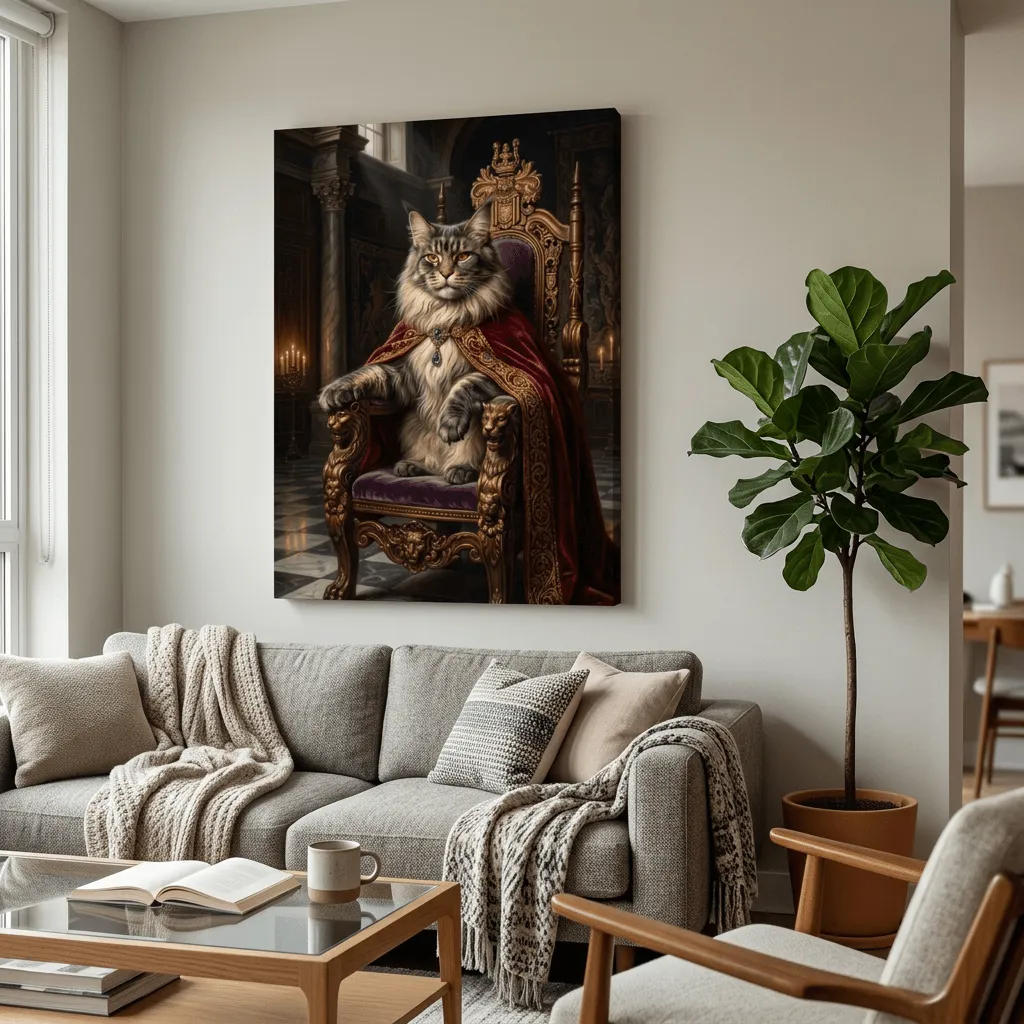 This striking realistic portrait renders a majestic cat adorned in royal crimson robes and sapphire jewels, seated upon an ornate golden throne. Rich detail and lifelike fur textures create a commanding canvas print perfect for adding whimsical sophistication to any room.
