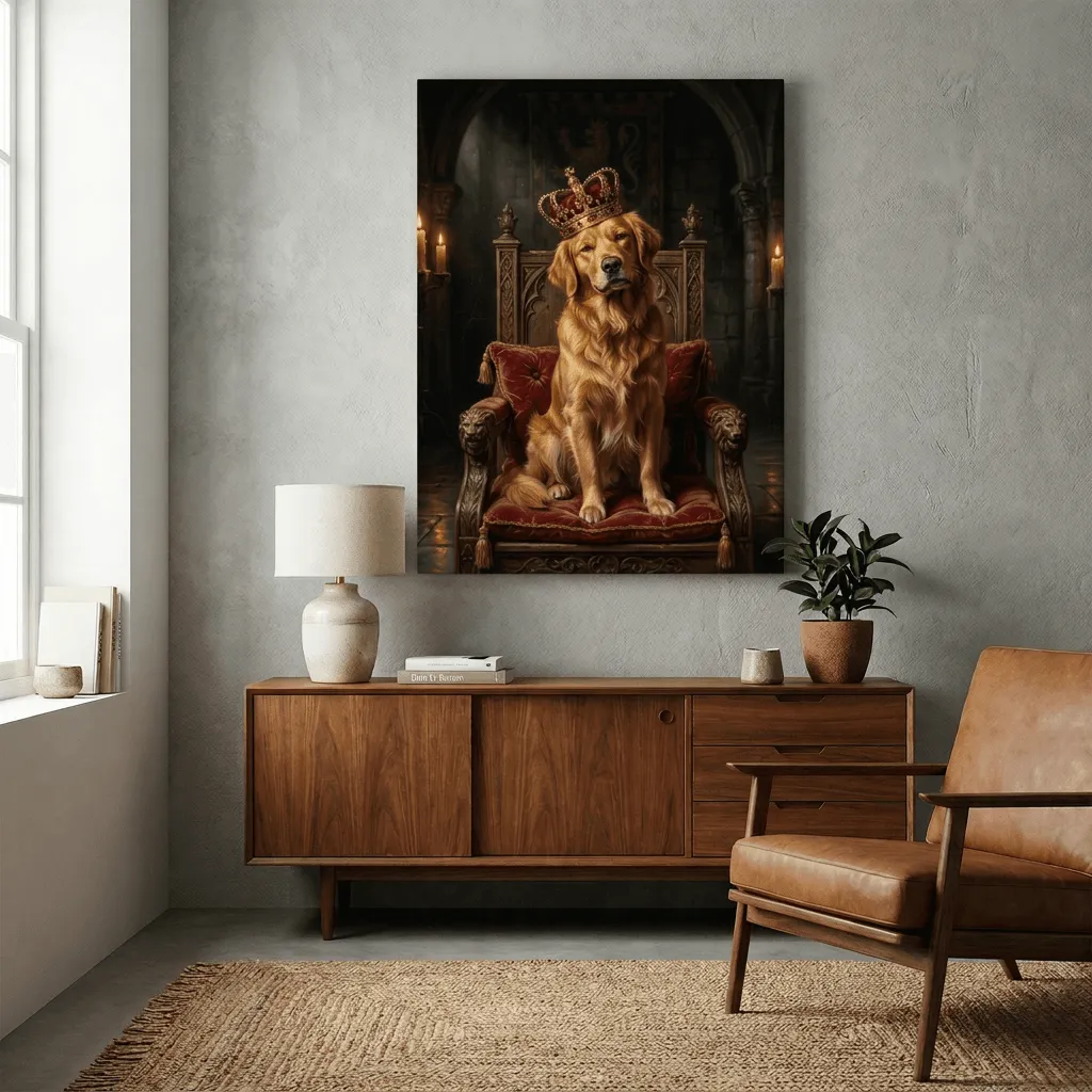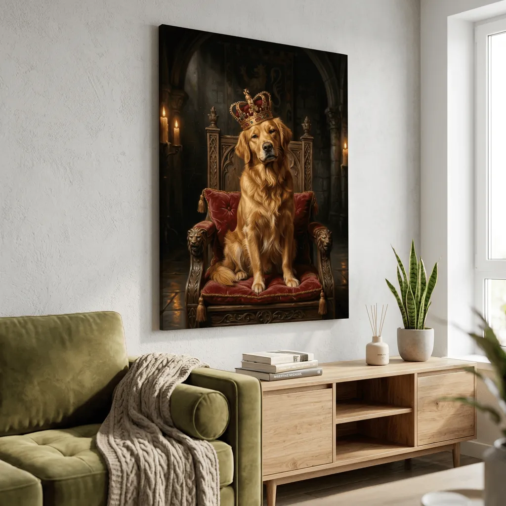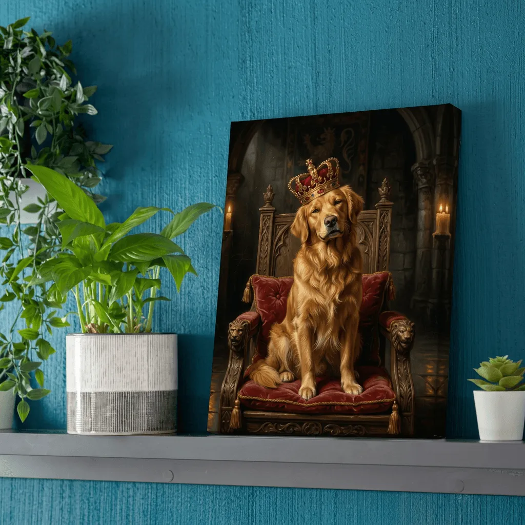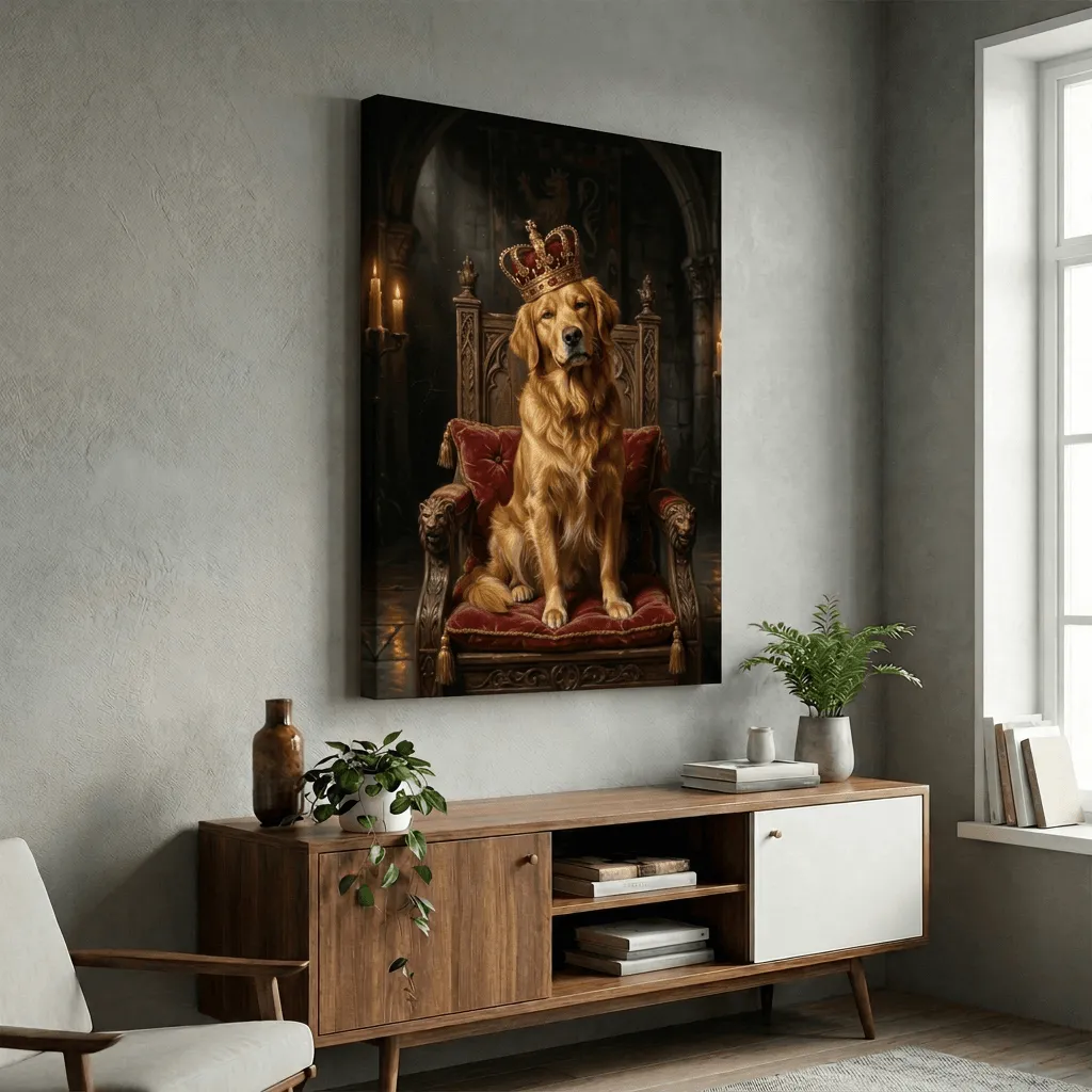 Rendered in rich realistic oil painting style, this majestic portrait captures a regal golden retriever crowned and seated upon an ornate velvet throne. Warm amber tones and intricate architectural details create a commanding canvas print perfect for adding personality and humor to any room.