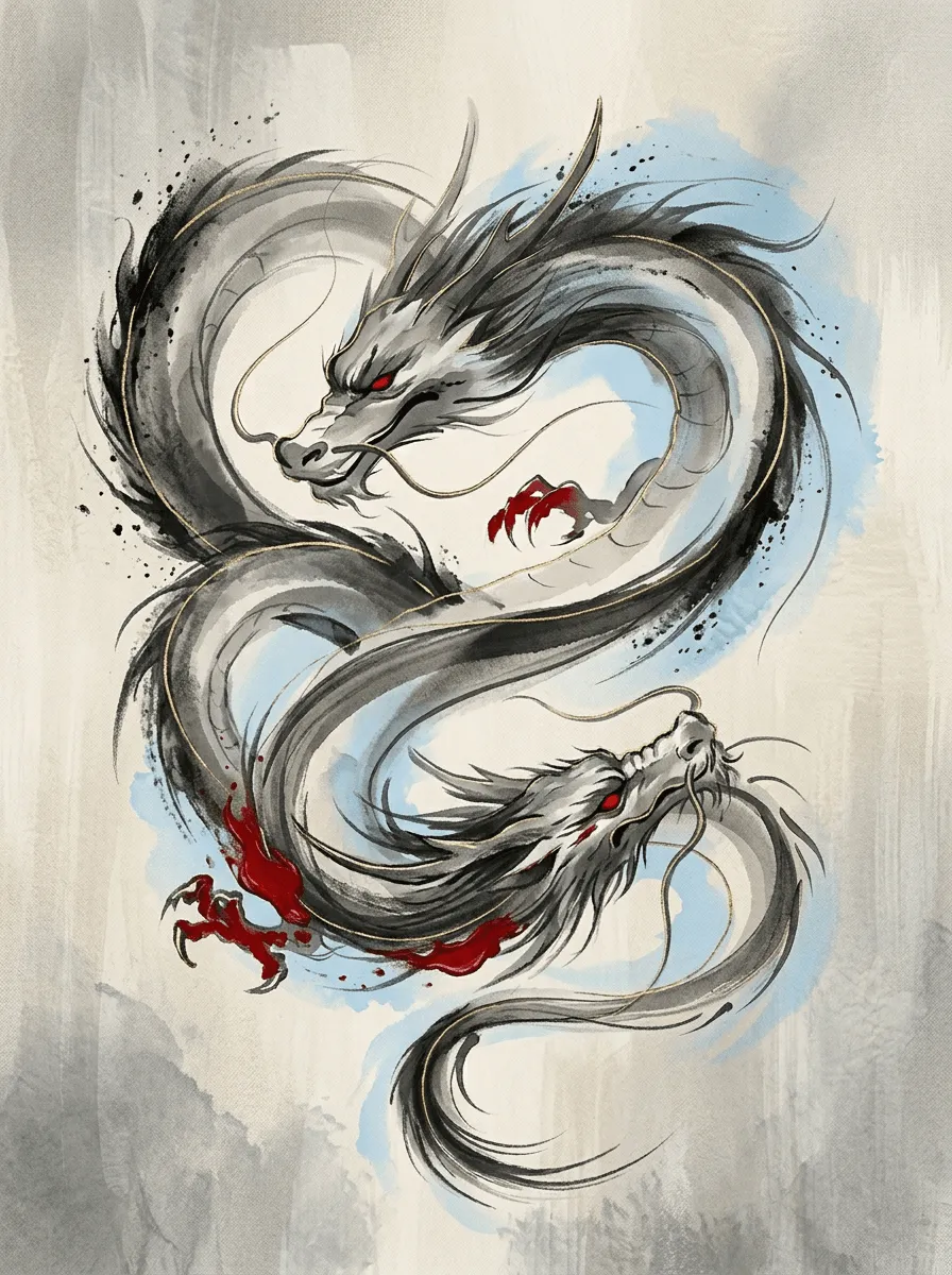 This striking ink and watercolor artwork features an elegant dragon rendered with flowing brushstrokes and soft blue washes. Bold red accents highlight the creature's fierce claws, creating a dynamic canvas print that brings mythical elegance to any room.